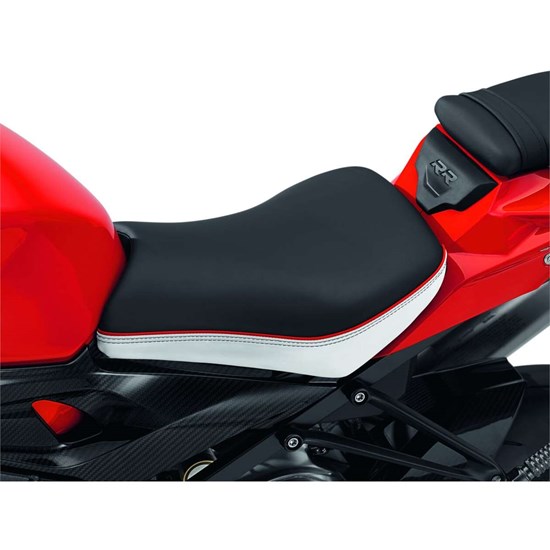 Die Komfortsitzbank bietet dank einer zusätzlichen Polsterung und einer um 35 auf 850 mm gesteigerten Sitzhöhe ein spürbares Plus an Sitzkomfort und damit noch mehr unbeschwerte Kilometer für den Fahrer. Ihre Dreifarbigkeit (Schwarz, Rot und Weiß) wertet das Motorrad zudem optisch auf.